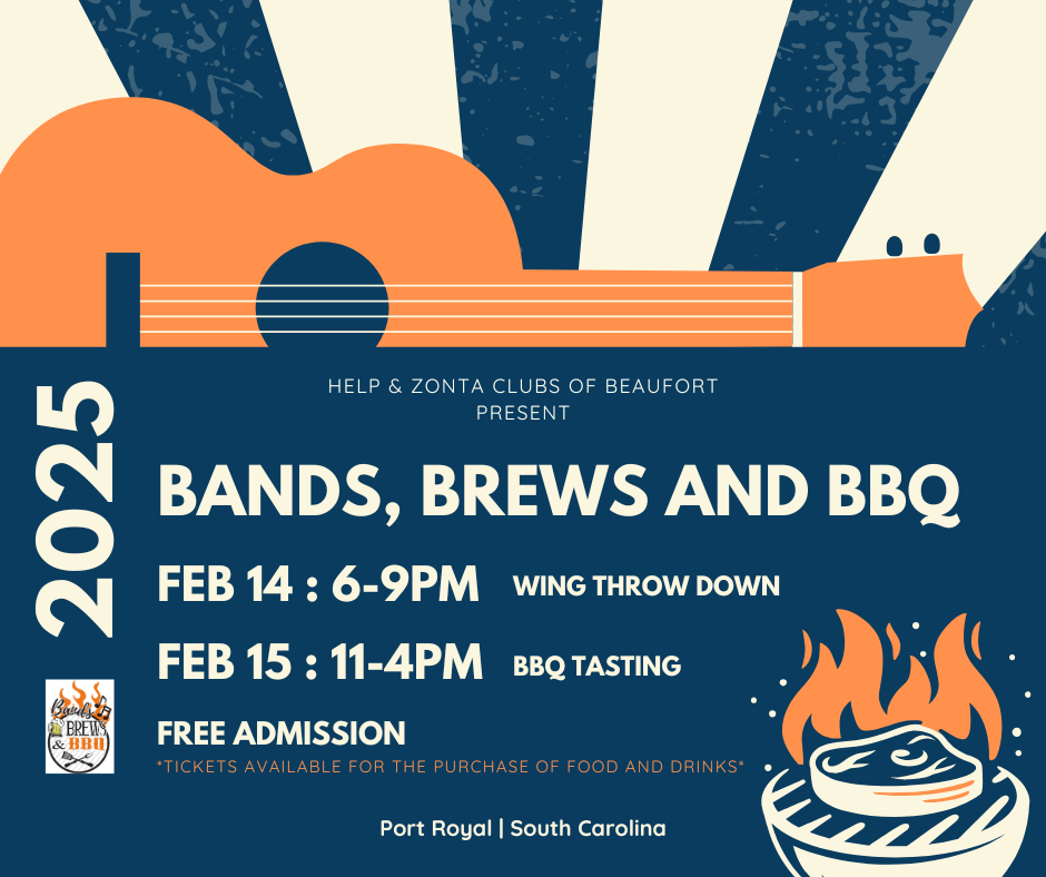 The 2025 Bands, Brews & BBQ event is a two-day celebration of food, music, and fun, taking place each February in Port Royal, South Carolina. This exciting event is officially sanctioned by the South Carolina Barbecue Association (SCBA) and is dedicated to benefiting two local nonprofit organizations: HELP of Beaufort and the Zonta Club of Beaufort.